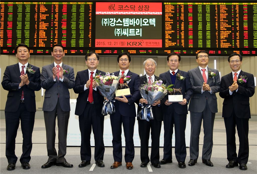 [아시아경제 박선미 기자]한국거래소 코스닥시장본부는 21일 오전 8시40분 서울사옥 홍보관에서 제대혈 줄기세포치료제 전문업체인 (주)강스템바이오텍과 로자틴정 등 의약품 전문 제조업체인 (주)씨트리의 코스닥시장 신규상장기념식을 개최했다.박선미 기자 psm82@asiae.co.kr<ⓒ세계를 보는 창 경제를 보는 눈, 아시아경제(www.asiae.co.kr) 무단전재 배포금지>