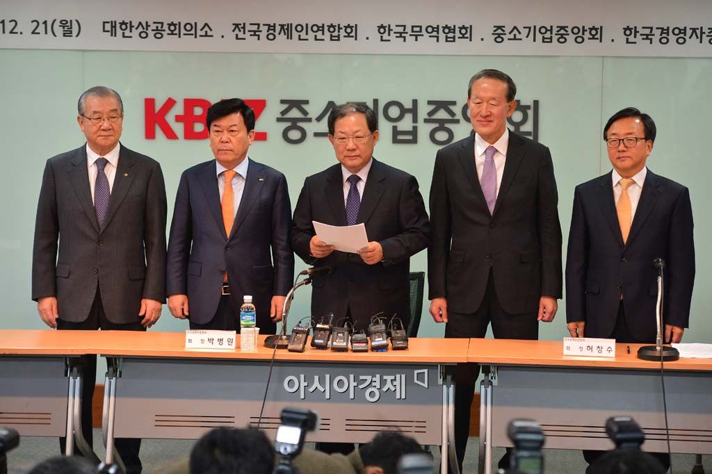 [아시아경제 백소아 기자] 21일 서울 영등포구 중소기업중앙회에서 열린 노동개혁 입법 촉구를 위한 경제5단체장 긴급 기자회견에서 참석자들이 발언을 하고 있다. 김인호 무역협회장, 박성택 중소기업중앙회장, 박병원 경총 회장, 허창수 전경련 회장, 이동근 대한상의 상근 부회장(왼쪽부터)백소아 기자 sharp2046@asiae.co.kr<ⓒ세계를 보는 창 경제를 보는 눈, 아시아경제(www.asiae.co.kr) 무단전재 배포금지>