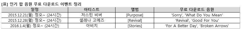 저스틴비버, 셀레나 고메즈, DJ 아비치 음원 매주 월요일 선착순 1000명에게 제공…1월4일까지[아시아경제 한진주 기자] 벅스가 저스틴 비버 등 유명 해외 아티스트 음원을 무료로 제공한다.벅스는 '추천앨범 리뷰'를 통해 21일부터 다음달 4일까지 주 1회에 한해 특정 음원을 무료로 제공한다고 밝혔다. 해당 음원은 매주 월요일 낮 12시부터 화요일 낮 12시까지 선착순 1000명에게 제공한다.'추천앨범 리뷰'는 곡 기준이 아닌 앨범 단위로 명반을 추천해 주는 벅스의 차별화된 서비스다. 국내 음악전문가와 벅스의 음악 큐레이터들이 과거부터 현재까지 발매된 모든 앨범 중 선별해 추천한다. 이용자들이 음악 견문을 넓힐 수 있도록 명반도 추천해준다. 21일은 저스틴 비버의 [Purpose] 앨범에 수록된 'Sorry'와 'What Do You Mean'을 제공한다. 28일은 셀레나 고메즈(Selena Gomez)의 최신 앨범 [Revival] 중 'Revival'과 'Good For You'를, 1월4일에는 스웨덴 출신 DJ 아비치(Avicii)의 두번째 정규앨범 [Stories]에 수록된 'For A Better Day', 'Broken Arrows'를 다운받을 수 있다.벅스는 이번 인기 팝 음원 이벤트를 시작으로, 매주 월요일 정오마다 특정 음원 무료 다운로드 행사를 이어갈 계획이다.벅스 관계자는 "추천앨범리뷰는 수많은 디지털 음원 속에 자칫 묻힐 수 있는 명반을 많은 사람들에게 소개해 온 벅스의 인기 콘텐츠"라며 "벅스가 선물로 준비한 음악과 함께 따뜻하고 행복한 연말 보내길 바란다"고 말했다.