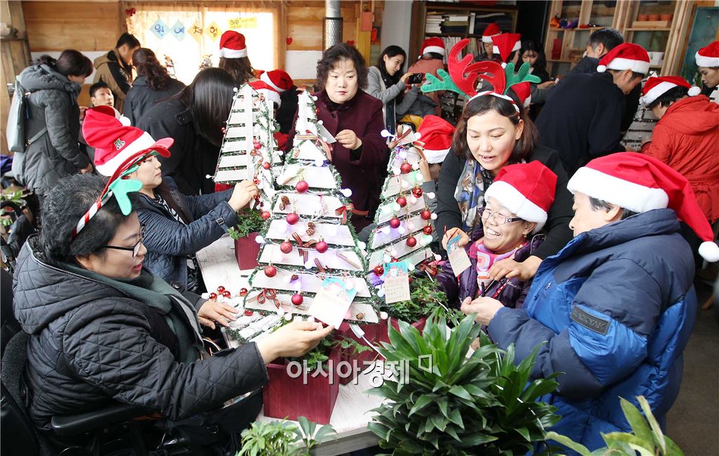 성탄절을 앞두고 21일 삼각동에 위치한 사회적 기업인 래인플라워에서 'FUN FUN한 크리스마스트리 만들기 체험 행사'가 열린 가운데 중증장애인을 비롯한 지역사회보장협의체위원등 50여명이 소원크리스마스트리를 만들어 보고 있다.<br />