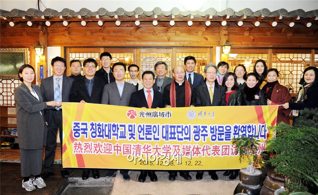윤장현 광주광역시장은 지난 18일 오후 시내 한 음식점에서 열린 중국 칭화대학교 및 언론인 대표단 환영 만찬에 참석해 방문단과 함께 기념촬영을 하고 있다.