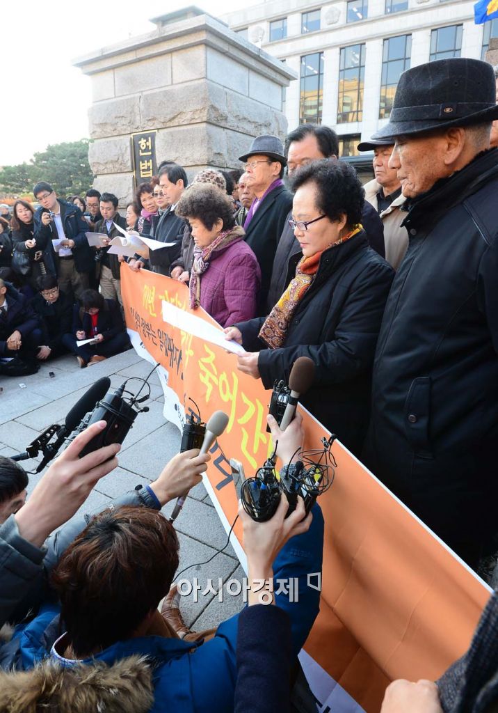 아시아경제 백소아 기자] 23일 서울 종로구 헌법재판소 앞에서 일제강점기 강제징용 피해자 유족들이 한일청구협정 위헌심판 선고에 대한 기자회견을 하고 있다. 이날 헌법재판소는 1965년 '대한민국과 일본국 간의 재산 및 청구권에 관한 문제의 해결과 경제협력에 관한 협정(한일청구협정)'은 위헌심판 대상이 아니라는 결정을 내렸다.백소아 기자 sharp2046@asiae.co.kr<ⓒ세계를 보는 창 경제를 보는 눈, 아시아경제(www.asiae.co.kr) 무단전재 배포금지>