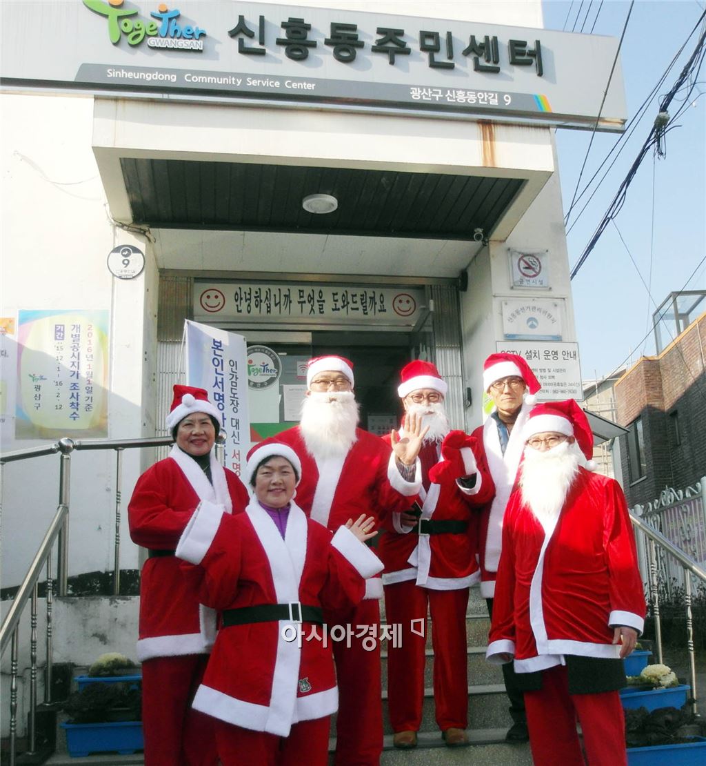 [아시아경제 노해섭 기자]성탄절을 앞두고 이웃사랑을 전하는 산타클로스가 광산 지역 곳곳에서 활동해 눈길을 끈다.송정1동에서는 몰래산타(대표 오성중) 10명은 23일 경로당과 한부모가정을 찾아가 선물을 전달했다. 몰래산타는 투게더광산 송정1동위원회 위원들이 만든 봉사 조직이다. 이들은 해년마다 성탄절 즈음에 산타클로스로 변장해 외로운 이웃을 찾아가고 있다. 올해는 송정1동 기타교실 회원과 지적장애인협회 광산구지부가 함께 해 손수 만든 목도리와 생필품 등을 선물했다.투게더광산 우산동위원 12명은 성탄 전날인 24일 경로당과 복지관, 장애인 아동을 찾아간다. 12명이 산타클로스는 투게더광산 우산동위원회가 마련한 양말과 가방 등을 이웃에게 전한다. 또 복지관과 경로당을 찾아 크리스마스 캐럴도 연주했다.신흥동에서도 산타클로스가 마을을 누볐다. 신흥동 사회단체 회원 10여 명이 지난 22일 어려운 이웃들을 직접 찾은 것. 신흥동 산타들은 동주민센터에 모인 쌀과 라면, 내복을 주민에게 고루 나눠줬다.산타클로스가 아니더라도 이웃사랑을 실천하는 주민의 선행은 계속 이어지고 있다. 외식업체를 운영하는 무진회관 정종욱 대표는 지난 21일 신흥동에서 홀로 사는 어르신 등 30여 명을 식당에 모셔 점심을 대접했다. 정 대표는 지역 어르신들께 점심상을 차려드리는 일을 8년째 이어가고 있다.많은 양의 쌀을 정기적으로 기탁하는 주민도 있다. 우산동주민센터에 따르면 ㈜정왕주택(대표 김용일)는 매월 백미 40포, ㈜케이케이건설(대표 강동식)은 ㈜김가네 호남체인본부(대표 육임준)가 올해 합산 각각 400포와 20포를 기증했다. 이들 회사 대표와 임직원들은 총 9000kg 달하는 쌀을 배달하는 작업에도 참여해 눈길을 끌었다. 노해섭 기자 nogary@<ⓒ세계를 보는 창 경제를 보는 눈, 아시아경제(www.asiae.co.kr) 무단전재 배포금지>