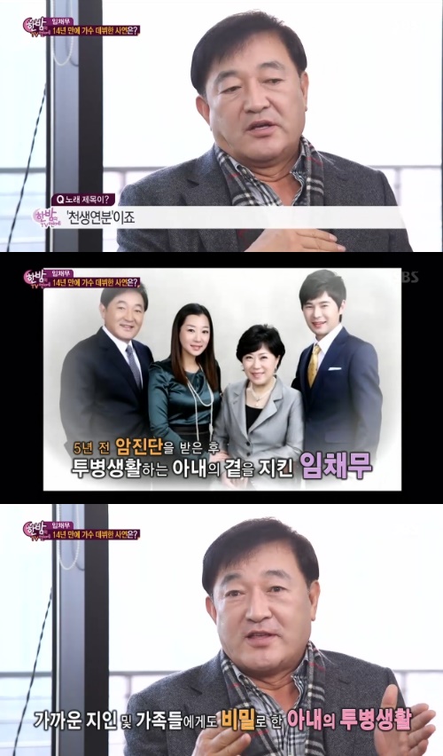 [아시아경제 온라인이슈팀] 배우 임채무의 아내가 세상을 뜬 사실이 뒤늦게 밝혀졌다.23일 SBS ‘한밤의 TV연예’에서는 14년 만에 5집 앨범을 발매한 배우 임채무의 인터뷰가 방송됐다. 이날 임채무는 얼마 전 세상을 뜬 아내를 위한 신곡 ‘천생연분’을 소개했다.그는 “아내가 좋은 곳으로 간지 딱 6개월이 됐다”라며 “5년 전부터 암 진단을 받고 투병해왔는데 집사람이 남에게 아픈 모습을 보이는 게 싫다고 해서 형제들에게도 알리지 않았다”고 설명했다.이어 “신곡을 기획만 해놓은 상태에서 아내가 떠났다”며 “이 노래도 못 듣고 떠났다”고 말하며 진한 아쉬움을 드러냈다.임채무는 아내에게 전하고 싶은 말을 묻는 리포터의 질문에 “뭘 전한다고 듣겠느냐”면서 “잊어버리려고 애쓰고 있다. 가슴에 가지고 있으면 다른 삶이 안 된다”고 말해 안타까움을 자아냈다.온라인이슈팀 issue@asiae.co.kr<ⓒ세계를 보는 창 경제를 보는 눈, 아시아경제(www.asiae.co.kr) 무단전재 배포금지>