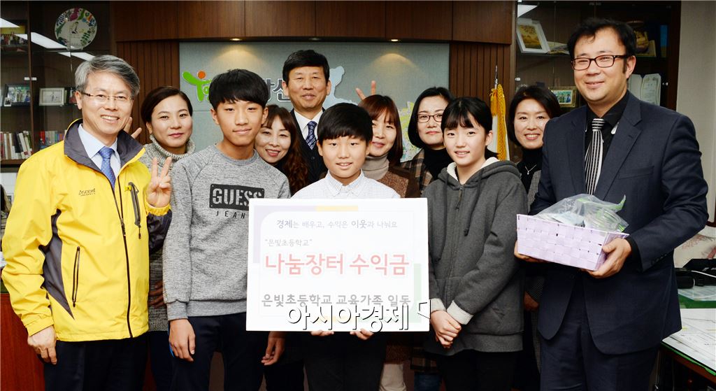 광주 은빛초등학교(교장 오철진) 어린이들이 24일 나눔장터를 열어 얻은 수익금 147만원을 투게더광산 나눔문화재단에 전달했다. <br />