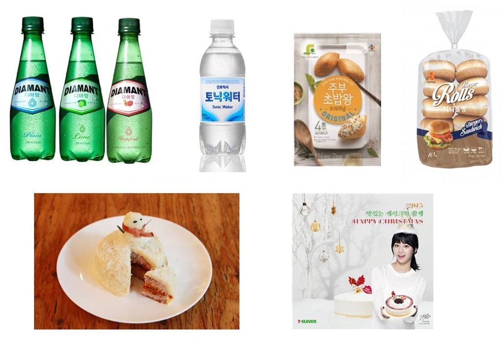 (왼쪽 위부터 시계방향 순) 하이트진로음료 ‘디아망’, ‘토닉워터’, CJ제일제당 ‘주부초밥왕’, 삼립식품 ‘미니롤빵’, 세븐일레븐 ‘홈파티 세트’, 존쿡 델리미트 ‘스노우맨 미트 케이크’