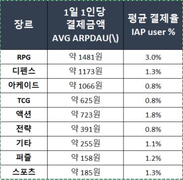 [아시아경제 안하늘 기자] 가장 높은 1인당 결제율(ARPU)을 기록한 게임 장르는 역할수행게임(RPG)으로 조사됐다. RPG 이용자들은 하루 평균 1481원을 결제한 것으로 나타났다. 27일 마케팅 업체 애드웨이즈에 따르면, 올해(12월 3주까지) 구글 플레이 매출 기준 상위 100개 게임을 조사한 결과 RPG가 가장 높은 ARPU를 기록했다.RPG는 이용자가 게임 속 캐릭터가 돼 레벨을 높이고 아이템을 획득하는 방식이다. 경쟁 요소를 강조해 국내에서 가장 인기를 받고 있는 장르다. 현재 매출 상위 10개 게임 중 7개가 RPG다.RPG 전체 이용자 중 평균적으로 게임에 결제를 하는 이용자는 3%에 달했다.상대방의 공격을 방어하는 콘텐츠가 주를 이루는 디펜스 장르 이용자는 평균적으로 하루 1173원을 게임에 투자했다. 디펜스 장르 게임 이용자 중 결제를 하는 비류은 1.3%에 달했다.하루 평균 1인당 결제 금액(제공=애드웨이즈)
