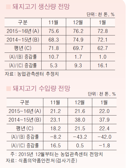 1월 돼지고기 생산량 증가에 가격 하락 전망1kg 당 4200~4500원 [아시아경제 김재연 기자]내년 돼지고기 가격이 하락할 전망이다. 돼지 생산 증가로 마릿수가 증가한데 따른 것으로 분석된다.28일 한국농촌경제연구원(KERI)이 발표한 축산관측 1월호에 따르면 1월 돼지 지육가격은 1kg당 4200~4500원으로 전망된다. 돼지 등급판정 마릿수 증가에 따른 것으로 전년 동기 4590원 대비 하락한 것이다. 실제 모돈수 증가에 따른 자돈 생산증가로 1월 등급판정 마릿수는 전년 동월 136만마리 보다 1.0% 증가한 137만 마리로 전망된다. 1월 생산량도 전년 동기보다 1.0% 증가한 7만3000t으로 추정된다. 수입량은 줄어들 것으로 예상된다. 국내 돼지고기 생산 증가에 따른 돼지 지육 가격 하락, 수입재고 누적으로 1월 돼지고기 수입량은 전년 동월보다 감소한 2만2000t으로 예상된다..