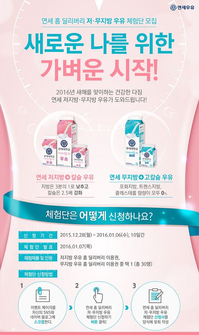 [아시아경제 이주현 기자]연세대학교 연세우유가 신년맞이 건강관리 및 다이어트를 결심하고 있는 사람들을 위해 저·무지방 우유 체험단 30명을 모집한다고 29일 밝혔다.이번 체험단 모집은 연세우유 블로그에서 1월6일까지 진행된다. 연세우유 블로그 이벤트 페이지에서 새해 건강관리 및 다이어트를 위한 결심 메시지를 남겨주면 신청 완료되며, 체험단 활동은 1월11일부터 24일까지 총 2주간 진행될 예정이다.추첨을 통해 선발된 체험단 30명에게는 연세 홈 딜리버리를 통해 무지방+고칼슘우유 또는 저지방+칼슘우유의 한 달 무료 음용권이 제공된다. 또한 체험 후기를 올린 소비자들 중 우수 후기자를 선정해 건강관리에 도움이 될 수 있는 샤오미 체중계와 미밴드 키트(1명), 운동키트(3명), 연세 홈 딜리버리 10% 할인쿠폰(5명) 등을 선물로 증정할 예정이다.한편, 체험 제품인 무지방+고칼슘우유는 지방은 0%로 낮추면서 칼슘은 일반우유 대비 2.5배 높인 무지방 우유다. 지방은 줄이면서 우리 몸에 필요한 단백질은 강화해 건강관리나 다이어트 등 식단조절이 필요할 때 단백질을 채워주는 영양 식품으로 제격이다. 또한 저지방+칼슘우유는 지방함량을 3분의1로 낮추고 칼슘과 식이섬유를 더해 균형 잡힌 영양섭취에 도움이 된다이주현 기자 jhjh13@asiae.co.kr<ⓒ세계를 보는 창 경제를 보는 눈, 아시아경제(www.asiae.co.kr) 무단전재 배포금지>