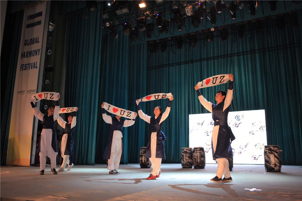포스코건설 대학생봉사단이 지난 26일 우즈베키스탄 부하라시에서 한류 전파와 양국 문화교류를 위한 글로벌 하모니 사회공헌활동을 펼치고 있다.(제공: 포스코건설)