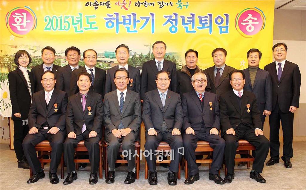 광주 북구(청장 송광운)는 29일 금수장호텔 아리랑 하우스에서 퇴직공무원 부부와 간부공무원이 참석한 가운데 구정발전을 위해 봉사하다 퇴직하는 선배 공무원에 대한 2015년도 하반기 정년퇴임식 행사를 가졌다. 사진제공=광주시 북구