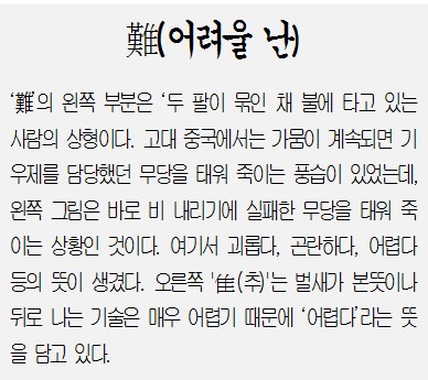 올해를 대표하는 한자로는 '어렵다', '괴롭히다', '막다'를 뜻하는 '난'(難)이 48.1%로 가장 많은 선택을 받았다. 이어 '답답하다', '울적하다'는 '鬱'(울)(21.7%), '변하다', '달라지다'는 '變'(변)(12.3%), '어둡다', '안개'를 뜻하는 '무'(霧)(4.7%)등이 꼽혔다.이동근 대한상의 상근부회장은 2015년을 '다사다난'(多事多難) 한 해라고 회고했다. 이 부회장은 "여러가지 사건도 많고 어려움과 탈도 많았던 한 해였지만 돌아보면 FTA로 세계 3위의 경제영토를 구축했고, 세계 6위의 수출강국, 사상 최고 국가신용등급 획득 등 이뤄낸 성과도 적지 않다"며 "내년 한해 기업과 국민, 정부, 국회 등 모든 경제주체가 하나의 팀플레이를 펼쳐 경제재도약이라는 희망이 이뤄지길 바란다"고 말했다. 이경호 기자 gungho@asiae.co.kr<ⓒ세계를 보는 창 경제를 보는 눈, 아시아경제(www.asiae.co.kr) 무단전재 배포금지>