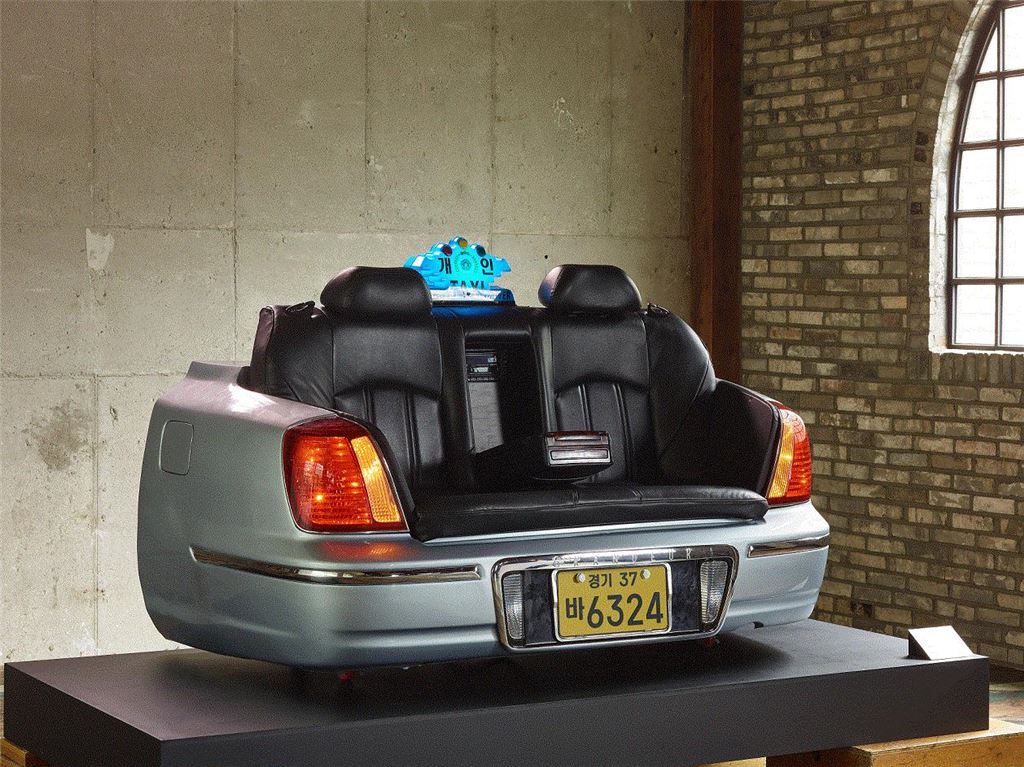 브릴리언트 메모리즈에 전시된 작품인 '택시기사'편의 '미스터 택시'. 은퇴하는 택시기사의 편안한 휴식을 기원하며 그랜저 택시 트렁크와 뒷좌석 시트를 활용해 소파 형태로 만든 작품.