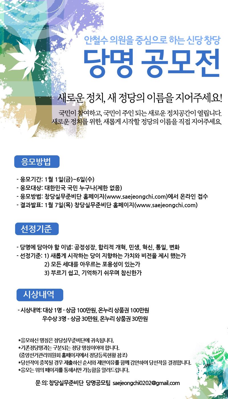 "새해 첫날부터 6일에 걸쳐...공정성장·합리적 개혁 등 주요 키워드 제시 " [아시아경제 노해섭 기자]안철수 의원을 중심으로 하는 신당 창당 실무 준비단이 전 국민 대상 당명 공모에 나섰다.창당을 추진 중인 안철수 의원을 중심으로 하는 신당 창당 실무 준비단(단장 이태규)이 새해 1월 1일부터 6일까지 전 국민을 대상으로 당명을 공모한다고 31일 밝혔다.실무단은 당명의 주요 키워드로 공정성장, 합리적 개혁, 민생, 혁신, 통일, 변화를 제시했다.실무단 관계자는 당명의 선정 기준에 대해 “새롭게 시작하는 정당이 지향하는 가치와 비전을 제시하고 모든 세대를 아우르는 포용성을 갖춰야 하며, 부르기 쉬우면서도 기존 정당의 명칭과 구분되는 참신성을 갖춰야 한다”고 밝혔다. 응모작 가운데 대상 1명에게는 상금 100만원과 100만원 상당의 온누리 상품권, 우수상 3명에게는 상금 30만원과 30만원 상당의 상품권이 부상으로 각각 주어진다.신청은 창당 실무 준비단 홈페이지(www.saejeongchi.com)에서 할 수 있다. 노해섭 기자 nogary@<ⓒ세계를 보는 창 경제를 보는 눈, 아시아경제(www.asiae.co.kr) 무단전재 배포금지>