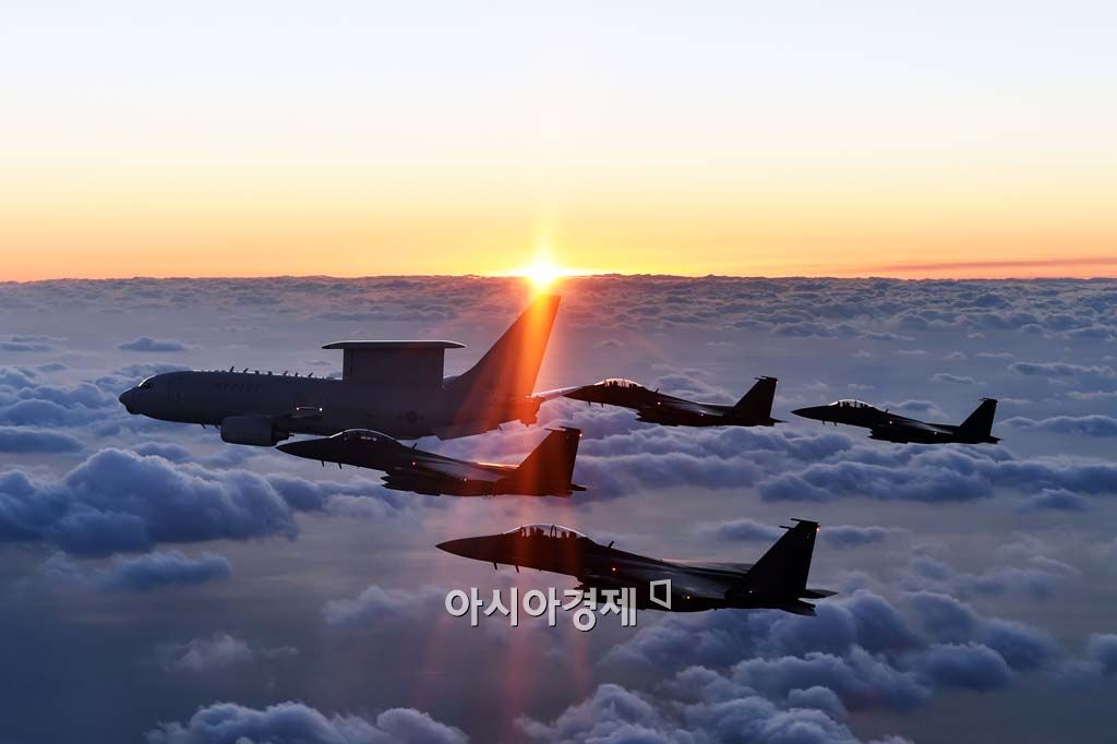 [아시아경제 ] 2016년 새해를 맞아 공군이 실시한 초계비행에 참가한 E-737 피스아이(선두)와 최강의 전투기 F-15K 편대가 대한민국의 동해안 호미곶 상공에서 일출을 맞이하고 있다. <ⓒ세계를 보는 창 경제를 보는 눈, 아시아경제(www.asiae.co.kr) 무단전재 배포금지>