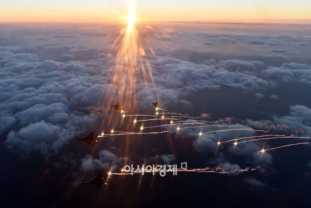 [아시아경제 ] 2016년 새해를 맞아 공군이 실시한 초계비행에 참가한 공군 E-737 피스아이(선두)와 F-15K 편대가 일출을 배경으로 플레어를 발사하며 기동하고 있다.<ⓒ세계를 보는 창 경제를 보는 눈, 아시아경제(www.asiae.co.kr) 무단전재 배포금지>