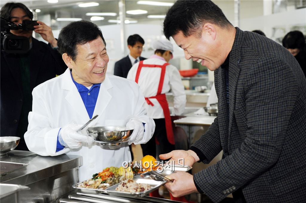 윤장현 광주광역시장은 31일 점심시간 시청 지하 1층 구내식당에서 올 한해 시정을 위해 함께 뛴 시 공직자들에게 배식 봉사를 하고 있다. 사진제공=광주시