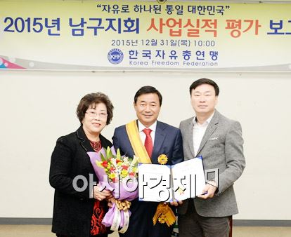 최영호 광주 남구청장은 31일 남구청 6층 중회의실에서 열린 ‘한국자유총연맹 광주 남구지회 2015 사업평가 대회’에서 민선 6기 구청장으로 재직하면서 주민 안보의식 함양 및 자유 민주주의 체제 수호의 공로를 인정받아 국제자유장을 수상했다. 사진제공=광주시 남구