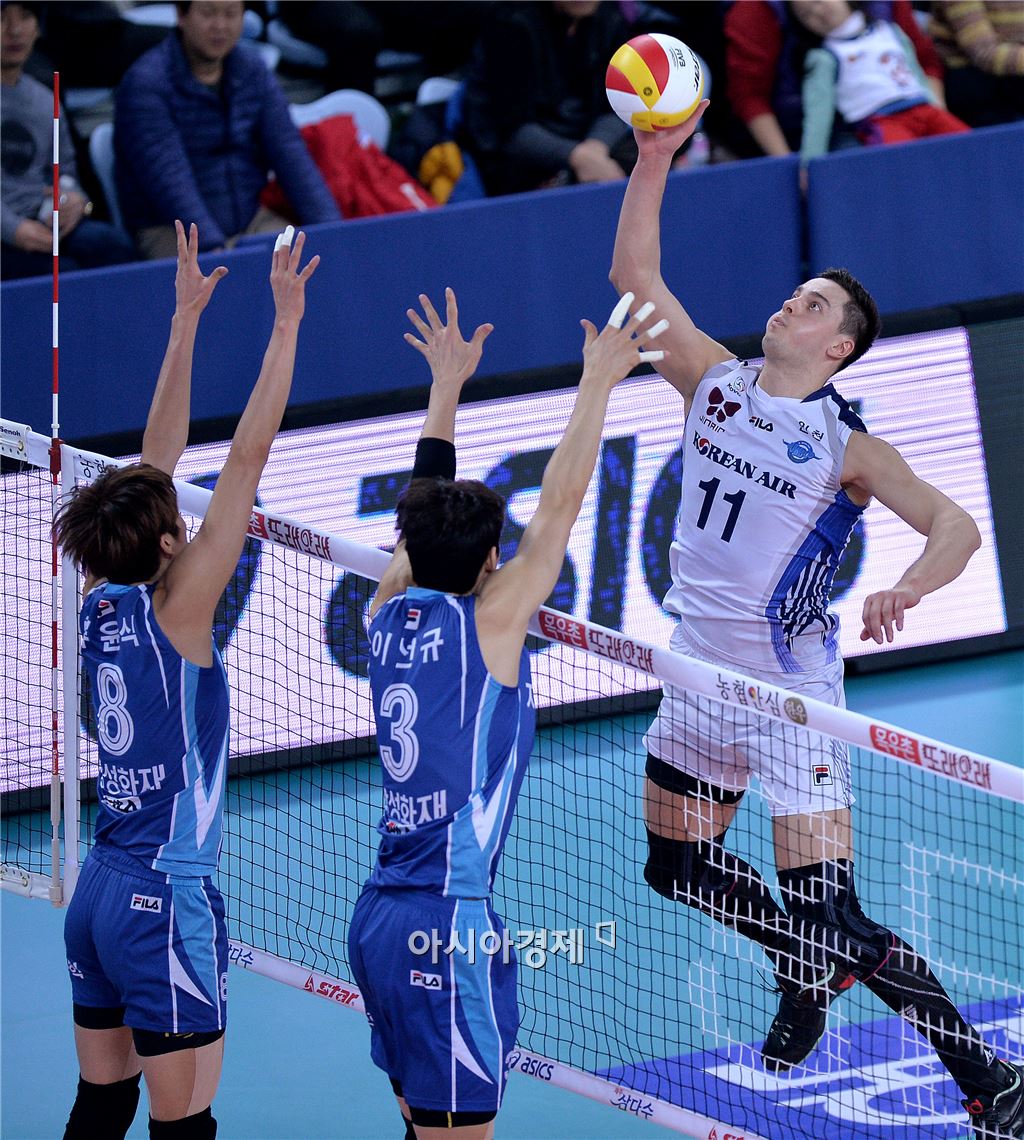 [인천=아시아경제 김현민 기자] 프로배구 2015-2016 V리그 남자부 대한항공과 삼성화재의 경기가 3일 인천 계양체육관에서 열렸다. 대한항공 모로즈가 상대 블로킹을 뚫고 공격하고 있다. 김현민 기자 kimhyun81@asiae.co.kr<ⓒ세계를 보는 창 경제를 보는 눈, 아시아경제(www.asiae.co.kr) 무단전재 배포금지>김현민 사진기자 kimhyun81@asiae.co.kr<ⓒ아시아 대표 석간 '아시아경제' (www.newsva.co.kr) 무단전재 배포금지>