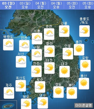 [아시아경제 온라인이슈팀] 새해 첫 월요일인 4일은 중국 북부지방에 있는 고기압의 가장자리에 들어 전국에 가끔 구름이 많을 예정이다.이날 밤부터 이튿날 사이에 서해안에는 바람이 강하게 부는 곳이 있겠고, 일부 내륙에도 약간 강하게 부는 곳이 있겠으니 시설물 관리에 유의해야 한다.아침 최저기온은 영하 2도에서 영상 6도, 낮 최고기온은 4도에서 15도로 예상된다.바다의 물결은 모든 해상에서 0.5∼2m로 일겠다.다음은 4일 지역별 날씨 전망. [오전, 오후] (최저∼최고기온) <오전, 오후 강수 확률>▲ 서울 :[구름많음, 구름많음] (2∼5) <20, 20>▲ 인천 :[구름많음, 구름많음] (2∼5) <20, 20>▲ 수원 :[구름많음, 구름많음] (1∼5) <20, 20>▲ 춘천 :[구름많음, 구름많음] (-1∼6) <20, 20>▲ 강릉 :[구름많음, 구름많음] (5∼10) <20, 20>▲ 청주 :[구름많음, 구름많음] (4∼8) <20, 20>▲ 대전 :[구름많음, 구름많음] (3∼8) <20, 20>▲ 세종 :[구름많음, 구름많음] (2∼8) <20, 20>▲ 전주 :[구름많음, 구름많음] (5∼10) <20, 20>▲ 광주 :[구름많음, 구름많음] (4∼11) <20, 20>▲ 대구 :[구름많음, 구름많음] (2∼10) <20, 20>▲ 부산 :[구름조금, 구름많음] (6∼14) <10, 20>▲ 울산 :[구름조금, 구름많음] (3∼15) <10, 20>▲ 창원 :[구름조금, 구름많음] (3∼14) <10, 20>▲ 제주 :[구름많음, 흐림] (10∼13) <20, 30>온라인이슈팀 issue@asiae.co.kr<ⓒ세계를 보는 창 경제를 보는 눈, 아시아경제(www.asiae.co.kr) 무단전재 배포금지>