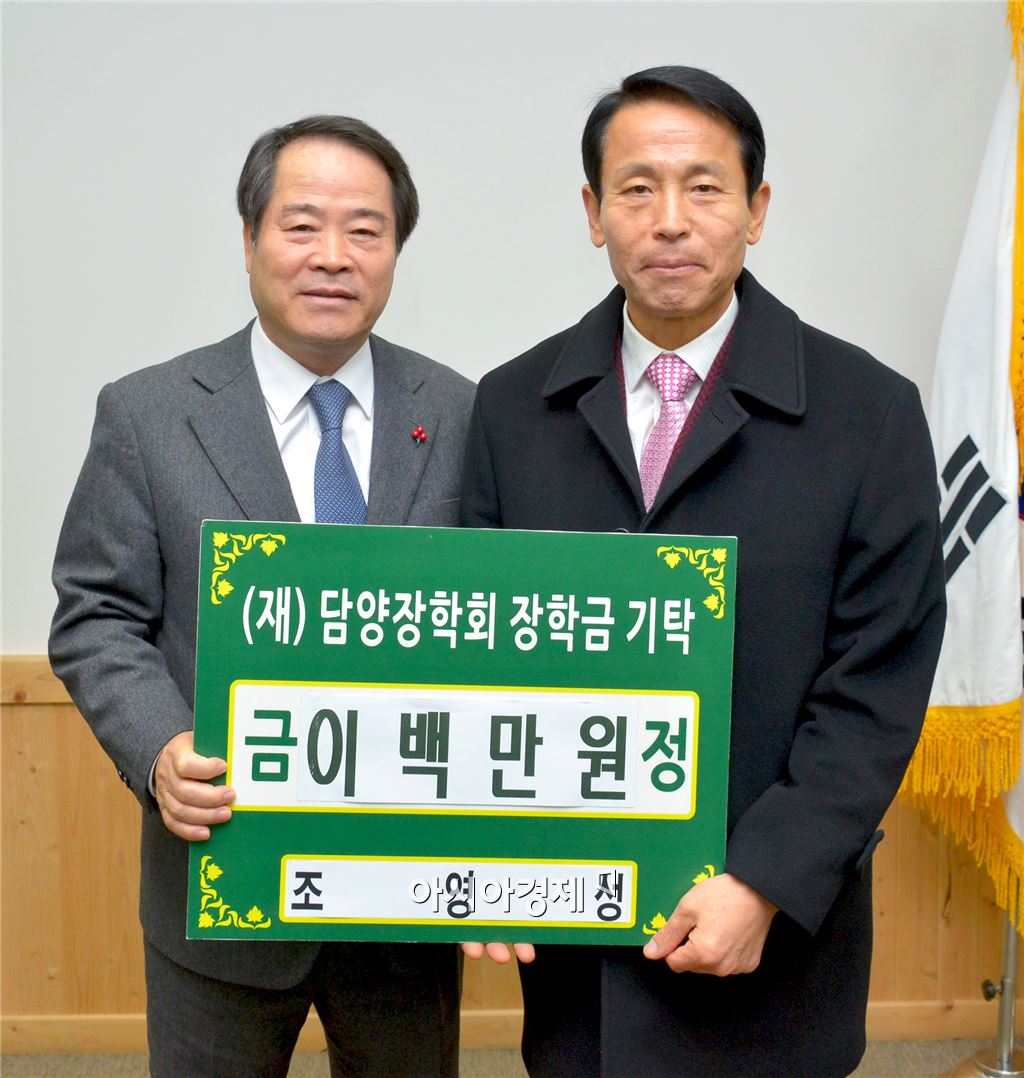 조영성 前 담양군 민원봉사과장이 지역인재육성을 위해 ‘장학금 200만원’을 전달하고 최형식 군수와 기념촬영을 하고 있다. 사진=담양군