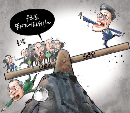 [아경만평]'우리도 뛰어내리세!'…벼랑의 文춤