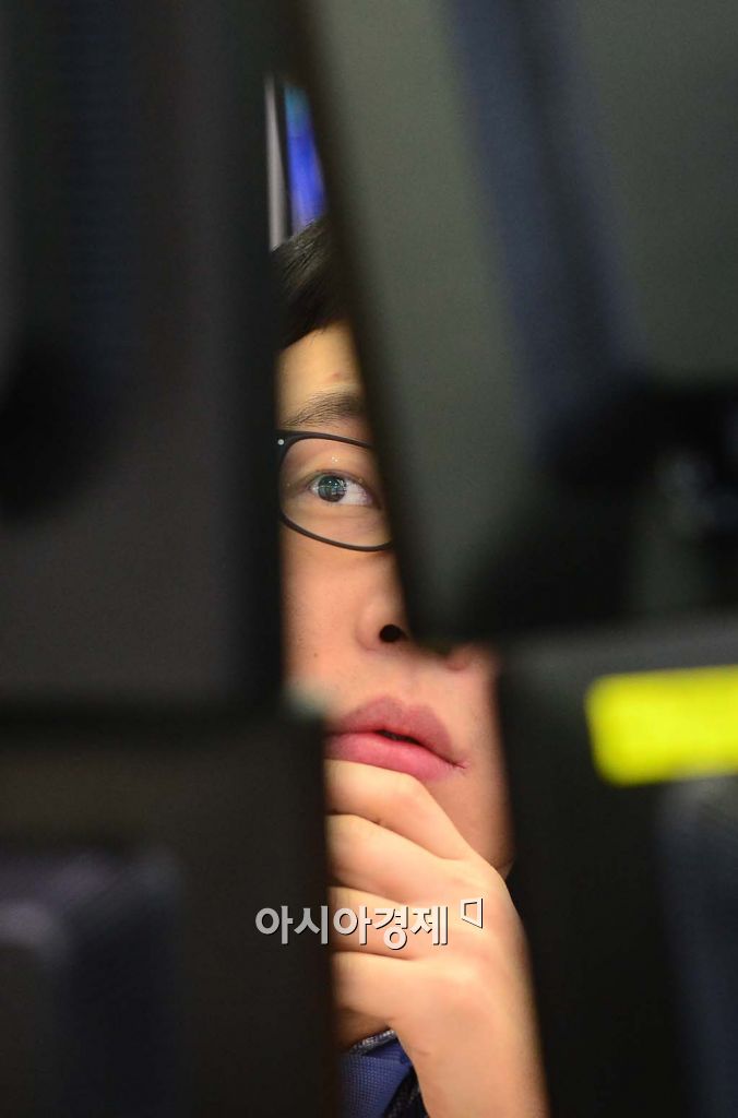 [아시아경제 백소아 기자] 중국발 블랙먼데이의 영향으로 세계 금융 상황이 출렁이고 있는 가운데 5일 서울 중구 KEB하나은행 본점 딜링룸에서 외환딜러들이 심각한 표정으로 모니터를 주시하고 있다. 이날 코스피 지수는 전날보다 6.83p 내린 1911.93p로 출발했지만 이내 반전상승해 1920선을 넘은 후 약보합세를 이어나가고 있다.백소아 기자 sharp2046@asiae.co.kr<ⓒ세계를 보는 창 경제를 보는 눈, 아시아경제(www.asiae.co.kr) 무단전재 배포금지>
