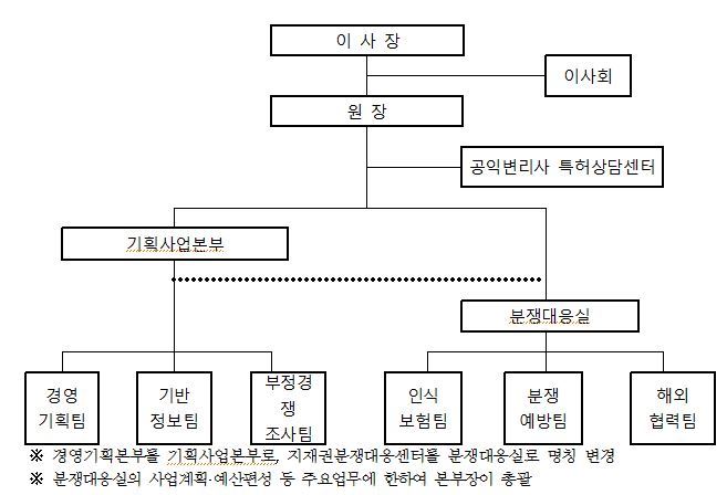 한국지식재산보호원의 조직도. 보호원은 개원 이후 1본부 1실 센터 6팀 등으로 운영된다. 특허청 제공