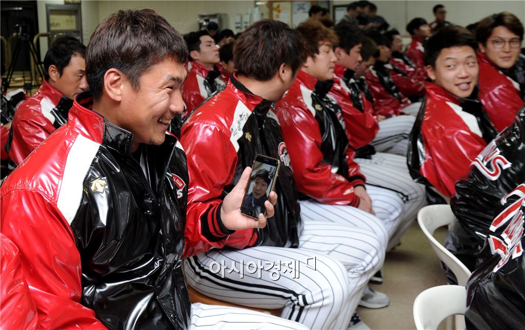 [잠실=아시아경제 김현민 기자] 프로야구 LG트윈스가 6일 서울 잠실야구장에서 시무식을 열고 2016년 한 해를 시작했다. 이동현이 미국 애리조나로 개인 훈련을 떠나 참석하지 못한 류제국에게 영상통화로 주장 선출 소식을 전하고 있다.김현민 기자 kimhyun81@asiae.co.kr<ⓒ세계를 보는 창 경제를 보는 눈, 아시아경제(www.asiae.co.kr) 무단전재 배포금지>