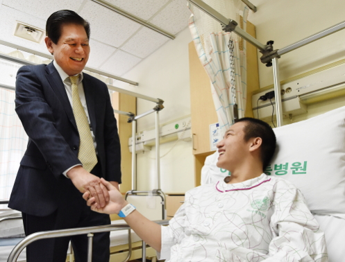 [아시아경제 고형광 기자] 효성그룹이 해외 현지 직원의 가족까지 돌보는 따뜻한 기업문화를 확산하면서 업계의 귀감이 되고 있다.효성은 이상운 부회장이 6일 이대목동병원을 찾아 효성 해외 의료봉사단 '미소원정대'의 후속치료 환자인 베트남 청소년 쩐득따이(Tran Duc Tai, 남·18세)를 위문했다고 7일 밝혔다.쩐득따이는 효성 베트남 법인에 근무하는 직원 쩐띠낌프엉(Tran Thi Kim Phuong, 여· 24세)의 친동생으로, 5살 때 교통사고로 뇌를 다쳐 왼쪽 팔과 두 다리의 근육이 위축돼 거동이 불편한 상태다. 효성은 지난해 미소원정대 활동을 통해 이 사실을 접하고 미소원정대 후속 치료 프로그램 대상자로 쩐득따이를 선정해 치료를 돕기로 했다.쩐득따이는 지난해 11월 말 한국에 입국해 이대목동병원에서 신경외과와 정형외과 수술을 받고 회복 중이다. 쩐득따이는 두개골 복원 수술을 받아 추가적인 부상 위험을 제거했으며 거동이 불편한 팔과 다리는 수술을 받은 후 재활 치료를 진행하고 있다.쩐득따이를 위문 방문한 이상운 부회장은 "베트남 청년 두 남매의 안타까운 사연을 접하고 회사 차원에서 후속치료 지원을 결정하게 됐다"며 "힘들었던 과거는 털어버리고 이들 남매의 앞날에 행복한 일들만 가득하길 바란다"고 말했다.'미소원정대'는 효성이 진출해 있는 해외 사업장의 지역사회 발전을 돕기 위해 2011년부터 파견하고 있는 해외 의료봉사단이다. 현지에서 치료가 어려운 환자를 한국으로 초청하는 후속치료 활동은 2014년부터 2년째 진행 중이다. 효성은 후속치료에 소요되는 비용 전부를 지원한다.효성은 지난해 미소원정대 현지 봉사활동 중 만난 구순구개열 환자 팜넛흐웬(Pham Ngoc Hyuen, 여·생후 4개월)도 한국으로 초청해 치료를 진행할 예정이다. 팜넛흐웬은 구순구개열로 인해 모유 수유가 불가능한 생후 4개월된 영아다. 조기에 치료받지 않으면 향후에도 정상적인 음식 섭취와 발성 장애, 영구적인 얼굴 변형이 유발될 우려가 있다. 효성은 이달 중 가천대 길병원에서 팜넛흐웬이 구순구개 봉합 수술을 받을 수 있도록 지원할 계획이다.고형광 기자 kohk0101@asiae.co.kr<ⓒ세계를 보는 창 경제를 보는 눈, 아시아경제(www.asiae.co.kr) 무단전재 배포금지>