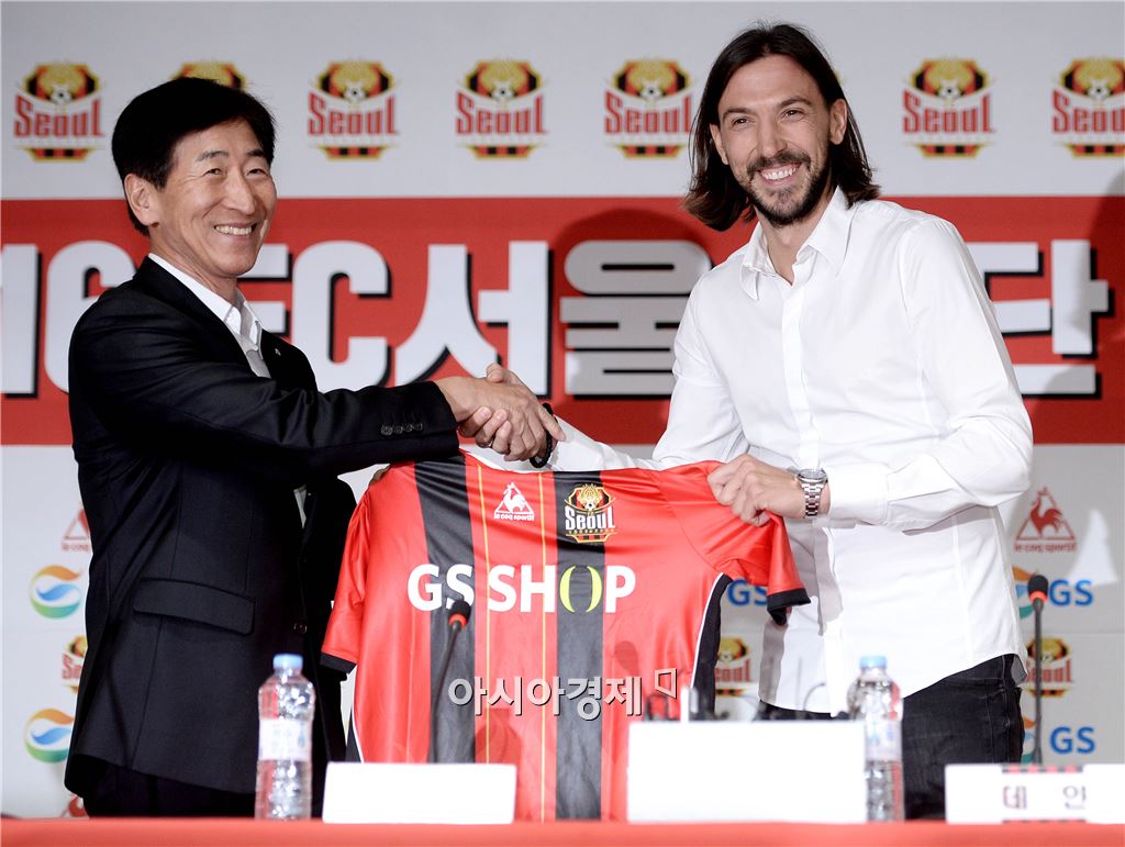 [상암=아시아경제 김현민 기자] 프로축구 FC서울이 7일 서울월드컵경기장에서 2016 시즌을 앞두고 영입선수 입단 기자회견을 열렸다. 2년 만에 FC 서울로 돌아온 데얀이 장기주 사장과 악수하고 있다. 김현민 기자 kimhyun81@asiae.co.kr<ⓒ세계를 보는 창 경제를 보는 눈, 아시아경제(www.asiae.co.kr) 무단전재 배포금지>
