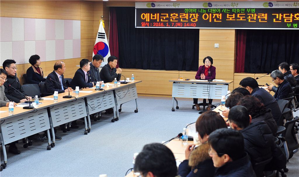 인천 통합예비군훈련장의 부평구 산곡동 이전 계획과 관련해 홍미영 부평구청장이 7일 긴급 간담회를 열고 있다. [사진= 부평구 제공]