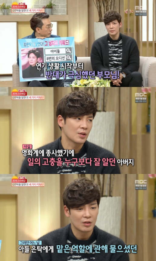 [아시아경제 온라인이슈팀] 배우 강은탁이 아버지 故신우철 감독에 대해 언급했다.8일 방송된 MBC '기분 좋은 날'에서는 강은탁이 출연해 아버지인 故신우철 감독에 대해 회상했다.그는 "부모님이 배우 데뷔를 반대하셨냐"는 질문을 받자 "시작부터 많이 반대하셨다. 아버지께 많이 두들겨 맞았다"며 "아버지가 사실 영화계 쪽에 종사하셨다. 감독이시기도 했고 배우이시기도 했고 제작자이시기도 했다. 고 신우철이 아버지였다. 대학 들어간 뒤 반목이 심했다"고 밝혔다. 이어 "2014년 여름 아버지가 돌아가셨다. 아이러니하게도 내 생일 첫 팬미팅을 하고 있는데 그날 일이 생겼다. 그래도 심장이 두 번 버텨줬다. 참 시기도 아이러니하게 '순금의 땅' 끝나고 '압구정백야' 들어가기 전까지 딱 3주 정도 시간이 있었는데 딱 그때 돌아가셨다. 아버지가 '압구정백야'는 못 보셨다"고 덧붙였다.그는 "아버지가 대종상 영화제 쪽 일을 하시며 갖고 계시던 트로피 미니어처를 내 방에 놓으셨다. 나중에 납골당에 넣어뒀는데 그 중 하나를 빼고 내 (신인상) 트로피를 넣었다"고 고백해 시청자들을 뭉클하게 했다.한편 강은탁은 지난해 '2015 MBC 연기대상'에서 연속극부문 남자 신인상을 수상한 바 있다. 온라인이슈팀 issue@asiae.co.kr<ⓒ세계를 보는 창 경제를 보는 눈, 아시아경제(www.asiae.co.kr) 무단전재 배포금지>