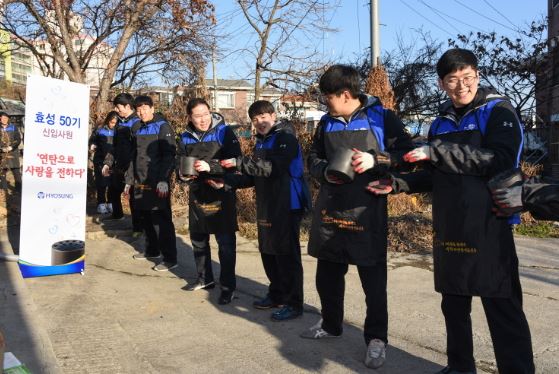[아시아경제 고형광 기자] 효성그룹 신입사원과 경인지역 임직원들이 8일 경기도 파주시 금촌동 일대에 연탄 1만장을 전달하는 '사랑의 연탄나눔' 활동을 펼쳤다.효성은 2014년부터 신입사원들을 사회적 책임을 다하는 효성인으로 육성하고자 입문교육 프로그램 중 하나로 사회공헌활동을 실시하고 있다.신입사원들은 추운 날씨에도 차량이 접근하기 힘든 집안까지 연탄을 배달하는 등 이웃에 대한 사랑을 직접 체험하는 뜻 깊은 시간을 가졌다. 신입사원들과 함께 직접 연탄 나르기에 동참한 조현상 효성나눔봉사단장(부사장)은 "50기 신입사원들과 함께 의미 있는 활동에 동참하게 돼 기쁘다"며"'사랑의 연탄나눔'을 통해 이웃과 함께하는 책임감과 효성인으로서의 소속감을 느끼는 시간이 되었길 바란다"고 말했다.효성 50기 신입사원들은 이달 4일부터 16일까지 약 2주간 그룹 입문교육을 받는다. 이들은 최고·혁신·책임·신뢰의 효성웨이(Hyosung Way) 핵심가치 학습과 울산·구미·창원 등의 지방 사업장을 견학하게 된다.효성은 '사랑의 연탄나눔' 활동 외에도 '사랑의 김치','사랑의 쌀'등 나눔 활동을 전개하고 있다. 이 외에도 효성은 기업의 사회적 책임을 다하기 위해 취약계층 자립 지원, 문화예술 후원, 호국보훈 활동 등 다양한 사회공헌활동을 펼치고 있다.고형광 기자 kohk0101@asiae.co.kr<ⓒ세계를 보는 창 경제를 보는 눈, 아시아경제(www.asiae.co.kr) 무단전재 배포금지>