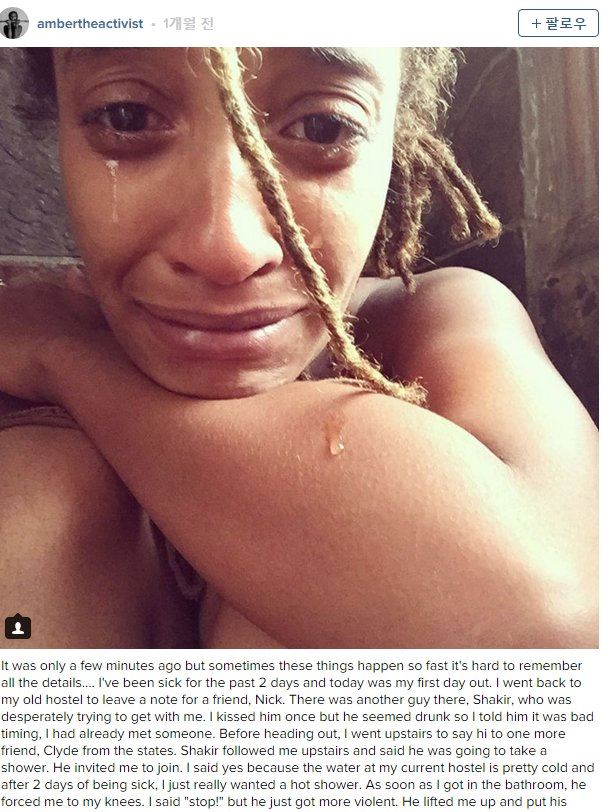 [아시아경제 온라인이슈팀]미국인 여성이 남아프리카 공화국에서 강간을 당했다며 상황을 실시간으로 자신의 인스타그램을 통해 공개해 논란이 되고 있다.최근 다수의 외신은 뉴욕 출신의 앰버 아모르가 최근 남아프리카 공화국에서 강간을 당한 사실을 인스타그램에 공개했다고 보도했다. 보도에 따르면 아모르는 남아프리카 공화국에서 자신의 과거 성폭행피해 경험을 살려 피해여성들에게 신고를 독려하는 캠페인을 진행하고 있다.아모르가 인스타그램에 공개한 내용에 따르면 알고 지내던 샤키르라는 남성이 그에게 같이 샤워를 하자고 제안했다. 아모르는 새로운 숙소에 온수가 나오지 않아 이 남성의 제안을 받아들였고, 샤워실에 들어가자마자 샤키르가 돌변해 자신을 강간했다고 주장했다. 아모르는 사건 직후의 사진과 함께, 당시 상황을 자세히 전하는 글을 자신의 인스타그램에 올렸다. 이어 샤워를 하면서 강간을 당해 모든 DNA증거가 없어졌을 것이기 때문에 경찰의 수사가 아무런 결실이 없을 것이라고 전했다. 또 아모르는 피해 사실을 실시간으로 업데이트한 이유는 자신이 성폭행을 당하는 것은 부끄러운 일이 아니고 피해 사실을 알려야 한다는 캠페인을 진행하고 있기 때문에 자신의 신념을 지키기 위해서라고 전했다. 한편 보도에 따르면 피의자 샤키르는 현지 경찰조사에서 성폭행이 아니었고 합의로 성관계를 가졌다고 진술했다.온라인이슈팀 issue@asiae.co.kr<ⓒ세계를 보는 창 경제를 보는 눈, 아시아경제(www.asiae.co.kr) 무단전재 배포금지>
