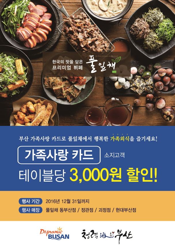 [아시아경제 오주연 기자]프리미엄 한식뷔페 풀잎채는 다자녀 가정을 위해 가족외식 혜택을 제공한다고 11일 밝혔다. 이번 이벤트는 가족사랑카드 소지자에게 테이블 당 1회 3000원 지원 혜택을 제공하는 행사다. 풀잎채 동부산점, 정관점, 괴정점, 현대백화점 부산점에서만 진행되며 주말은 물론, 공휴일에도 사용가능하다. 중복할인은 불가하다.가족사랑카드는 저출산 문제 극복 및 출산 친화적 사회분위기 조성을 위해 부산시가 지난 2008년부터 다자녀가정의 사회적 배려를 위해 시행한 정책 중 하나로, 부산에 거주하는 자녀가 세 명 이상인 가정에게 발급된다.오주연 기자 moon170@asiae.co.kr<ⓒ세계를 보는 창 경제를 보는 눈, 아시아경제(www.asiae.co.kr) 무단전재 배포금지>