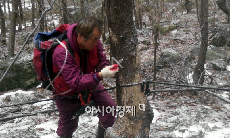 고로쇠 수액을 받기 위해 고로쇠나무에 채취용 드릴로 구멍을 뚫고 호스를 꽂고 있다. 사진=장성군