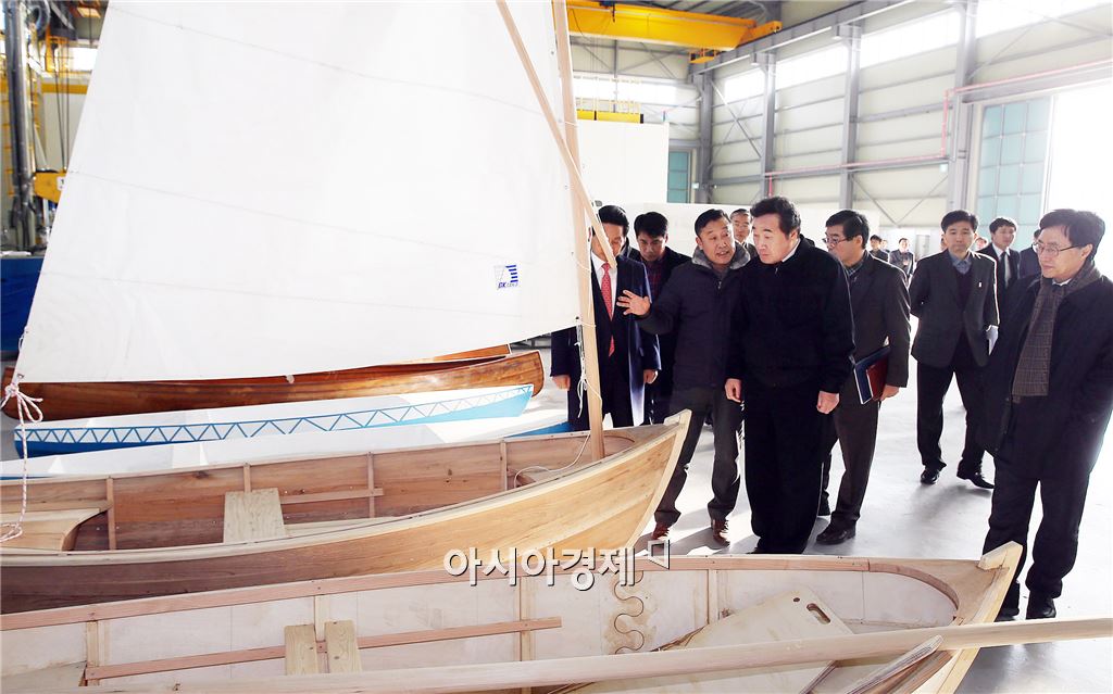 이낙연 전남지사가 11일 영암 대불산단에 있는 중소조선연구원(원장 김성환)을 방문, 전동평 영암군수와 레저선박 기반구축 장비, 보트개발 시설을 둘러보고 있다. 사진제공=전남도
