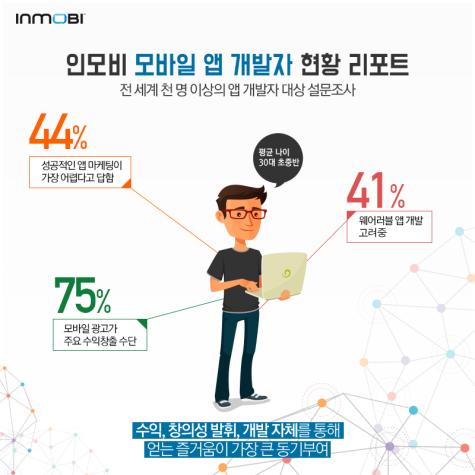 [아시아경제 강희종 기자]한국의 스마트폰 애플리케이션(앱) 개발자 평균 나이가 전세계에서 가장 높은 수준인 것으로 나타났다. 앱 개발자중 여성 비중은 매우 낮은 것으로 조사됐다.글로벌 모바일 광고 플랫폼 인모비(InMobi)는 12일 모바일 앱 개발자들을 대상으로 집행한 설문조사를 기반으로 '모바일 앱 현황' 보고서를 발간했다고 밝혔다.전 세계 1000명 이상의 개발자들이 참여한 이번 설문조사에 따르면 앱 개발 업종에서 남녀 성비 불균형이 두드러지게 나타났다. 설문 조사에 참여한 개발자중 여성의 비중은 전세계 평균 6%에 불과했다. 북미 지역이 가장 높은 11%로 나타났으며 한국의 여성 앱 개발자 비중은 전세계 평균과 같은 6%였다.설문조사를 실시한 155개국의 앱 개발자들의 평균 나이는 30대 초중반으로 나타났다. 한국 개발자들이 36세로 가장 높은 평균 연령대를 기록했다. 또한 10명 중 6명이 앱 개발에 3년 이상 종사하고 있다고 답했다. 인모비는 "모바일 앱 개발 업계가 어느정도 성숙 단계에 도달했음을 짐작해볼 수 있다"고 설명했다.이밖에 개발자들은 앱을 통해 창출하는 수익, 창의성을 발휘하는 일을 할 수 있다는 점과 개발 자체를 통해 얻는 즐거움을 가장 큰 세 가지 동기부여 요인으로 꼽았다. 국내 개발자 10명 중 7명은 모바일 광고를 수익창출 수단으로 활용하고 있다고 답했다. 앱의 유료화를 통해 수익을 낸다고 답한 개발자는 15%에 불과했다.국내 개발자들 사이에서 가장 인기 있는 프로그램 언어는 자바(Java)이며, 39%는 앱 개발에 HTML5 기술을 이용하고 있다고 답했다.앱을 개발하면서 개발자들이 가장 어렵다고 꼽은 과제는 마케팅(44%)이었다. 개발자들은 효율성이 좋은 모바일 마케팅을 통해 앱 디스커버리 확율을 높이는 것이 모바일 앱 마케팅의 난제라고 답했다.국내 앱 개발자 답변자 중 5%만이 웨어러블 기기용 앱을 개발한 경험이 있었다고 답했다. 하지만 41%는 향후에 웨어러블 용 앱 개발을 고려하고 있다고 밝혔다.이번 설문조사에는 2015년 9월과 11월 사이에 전 세계 1089명의 앱 개발자들이 PC와 모바일을 통해 답변을 제공했다. 한국에서는 109명이 참여했다.리포트 원본은 //resources.inmobi.com/devreportkorea를 통해 다운로드받을 수 있다.강희종 기자 mindle@asiae.co.kr<ⓒ세계를 보는 창 경제를 보는 눈, 아시아경제(www.asiae.co.kr) 무단전재 배포금지>