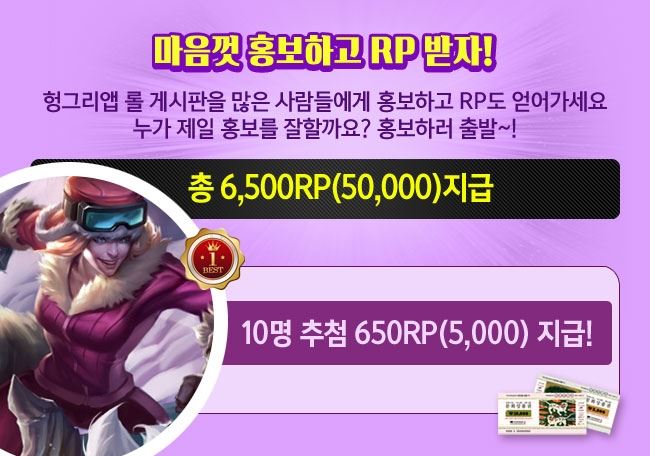 [아시아경제 온라인이슈팀] 라이엇게임즈에서 서비스하는 글로벌 인기 팀 대전 게임 ‘리그오브레전드(롤)’가 12일 공식 홈페이지를 통해 1월2주차 챔피언 로테이션을 공개했다. 1월2주차 챔피언 로테이션은 ‘갱플랭크’와 ‘바디’, ‘베인’, ‘벨코즈’, ‘브라움’, ‘블라디미르’, ‘시비르’, ‘아무무’, ‘이블린’, ‘카시오페아’다. 유저 커뮤니티 '리그오브레전드 헝그리앱'에서는 유저들이 신규 챔피언 로테이션 외에도 다양한 챔피언을 마음껏 이용할 수 있도록 리그오브레전드 RP(게임 캐시)를 지급하는 홍보 이벤트를 진행하고 있다.이번 이벤트는 '마음껏 홍보하고 RP 받자!'로 이벤트 기간 동안 지정 양식에 따라 페이스북이나 카카오스토리, 트위터 등 다양한 SNS에 글을 작성한 후, 인증화면을 캡처해 '리그오브레전드 헝그리앱' 커뮤니티에 게재하면 우수 참가자를 선정해 총 6500RP를 추첨을 통해 지급한다. 본 이벤트는 1월17일까지 진행하며 자세한 내용은 '리그오브레전드 헝그리앱' 커뮤니티 이벤트 공지를 통해 확인할 수 있다.헝그리앱에서 진행하는 다양한 이벤트와 커뮤니티 활동을 하면 헝그리앱 내에서 현금처럼 쓸 수 있는 밥알 포인트를 획득할 수 있다. 획득한 밥알 포인트는 ‘헝그리앱 헝앱샵’에서 ‘리그오브레전드 RP’, ‘문화상품권’, ‘구글플레이 기프트카드’를 비롯해 각종 게임 아이템, 아프리카TV 퀵뷰, 롯데리아 버거 세트, 던킨도너츠 팩 등 게임 및 실생활에 필요한 유용한 상품들을 구매할 수 있다.온라인이슈팀 issue@asiae.co.kr<ⓒ세계를 보는 창 경제를 보는 눈, 아시아경제(www.asiae.co.kr) 무단전재 배포금지>