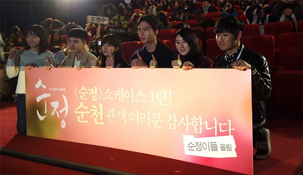 [영화 '순정' 출연자들이 12일 순천 CGV에서 첫 시사회와 쇼케이스를 열어 관객들의 뜨거운 호응을 얻었다.]