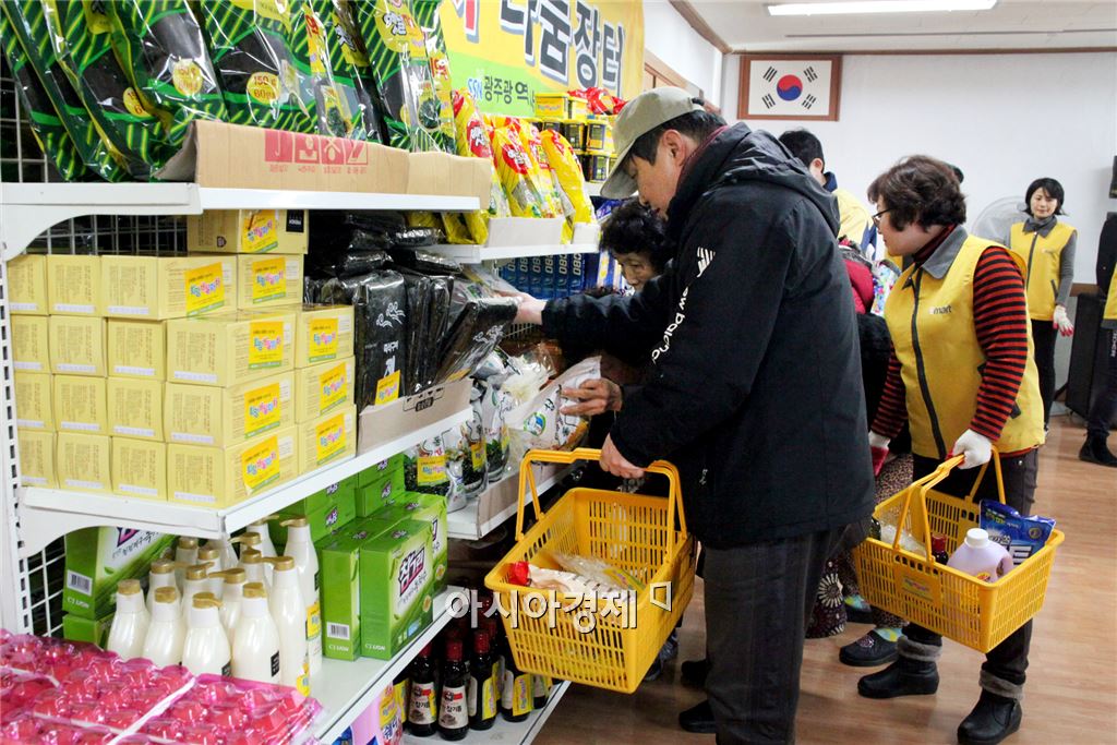 신세계와 이마트가 후원하고 광주광역시사회복지협의회가 주관하는 “희망배달마차 나눔장터”가 13일 동구 학운동 주민센터에서 열려 복지소외계층 90여명에게 5만원 상당의 식료품 및 생활필수품을 지원했다. 사진제공=광주시 동구