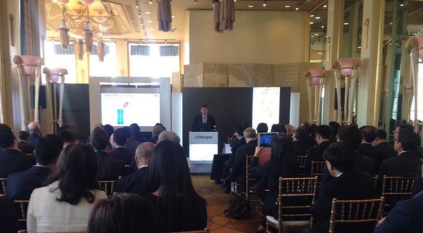 지난 11일(현지시간)부터 나흘간 미국에서 열린 제34회 JP모건 헬스케어 컨퍼런스에 참석한 한미약품 이관순 사장이 현재 개발 중인 혁신신약 파이프라인 및 오픈이노베이션 전략 등에 대해 발표하고 있다.<br />