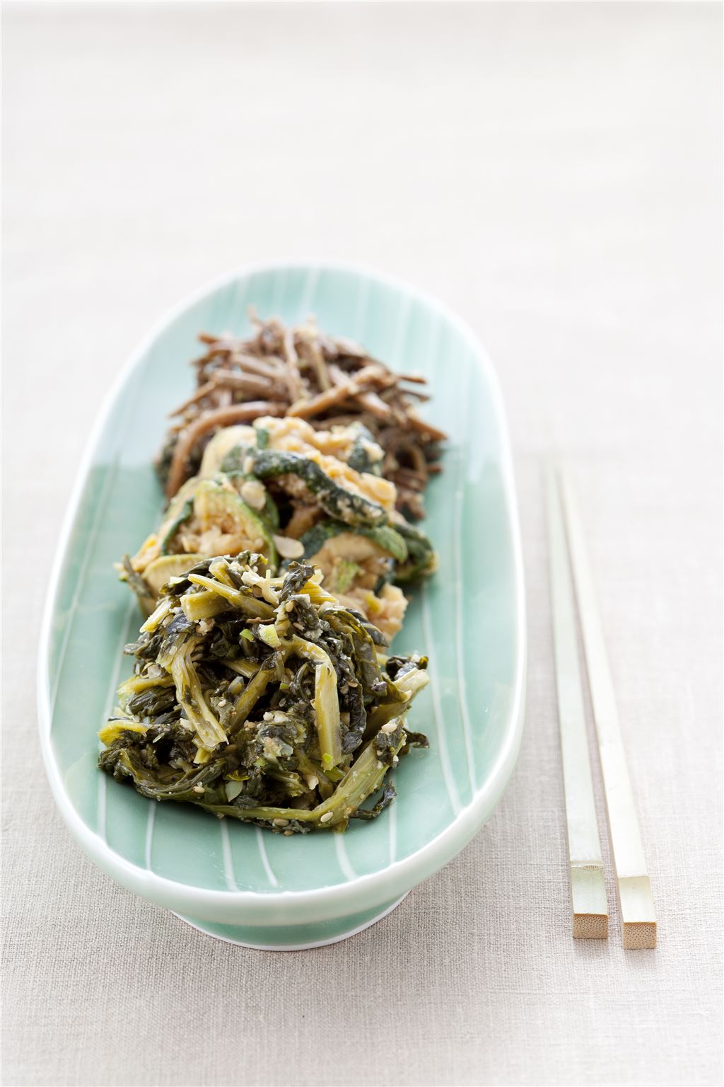 5. 손질한 나물은 각각 양념을 넣고 맛이 배이도록 조물조물 무친다.과정 6