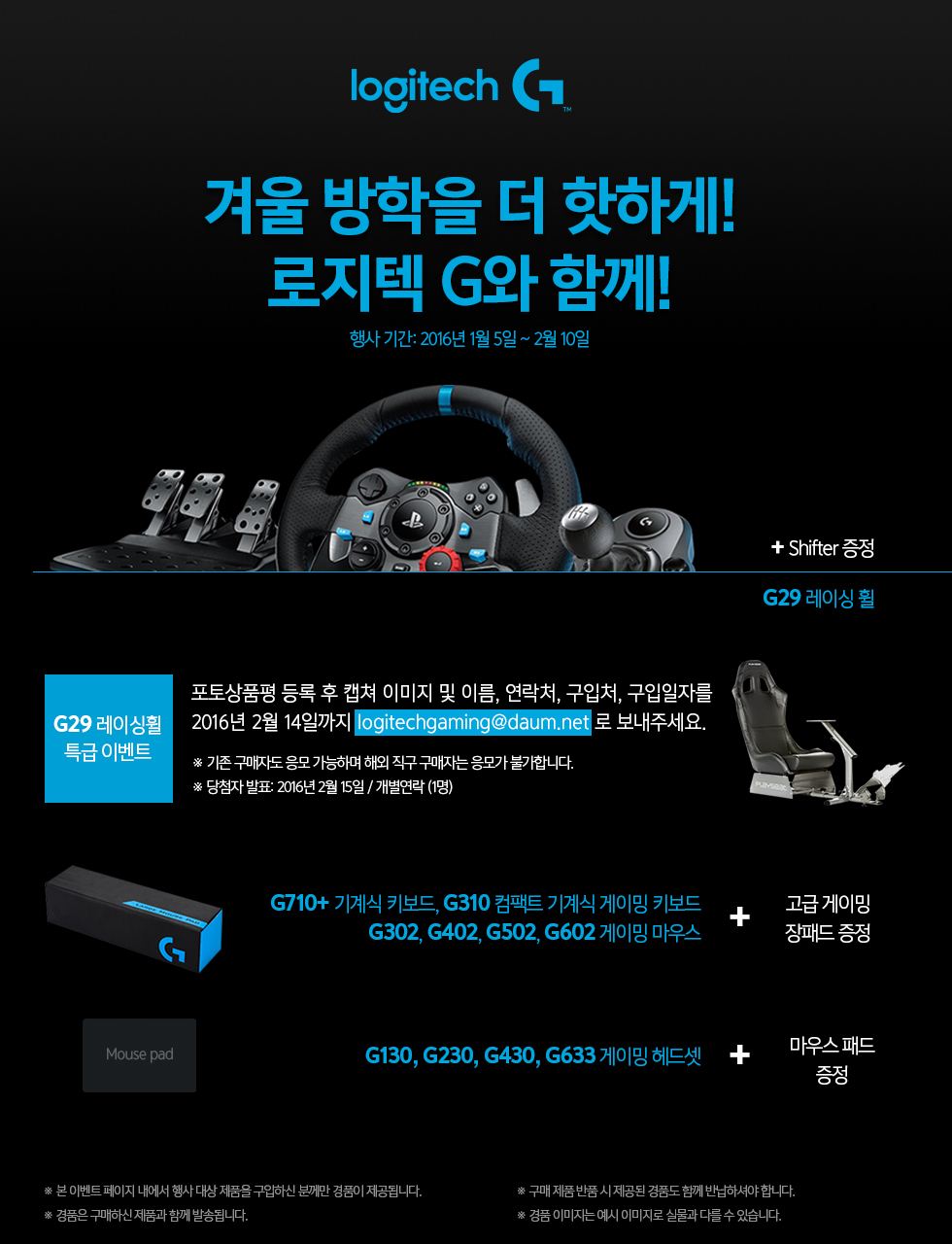 G29 레이싱 휠 구매 고객 전원에게 '드라이빙 포스 시프터' 무료 증정원숭이의 해 맞아 M238 해피마우스 구매 고객에게 초콜릿 제공[아시아경제 김유리 기자] 로지텍 코리아는 새해를 맞아 로지텍 G 게이밍 기어와 무선 키보드와 마우스 제품 구매 고객들을 대상으로 다양한 사은품을 증정하는 프로모션을 진행한다.'로지텍 G 겨울방학 게이밍 프로모션'은 다음 달 10일까지 주요 오픈마켓(G마켓, 11번가, 옥션, 인터파크)에서 진행된다. 로지텍의 게이밍 기어 구매 시 다양한 경품을 제공한다. 행사 기간 내 이벤트 페이지 내에서 G29 레이싱 휠을 구매하면 '드라이빙 포스' 6단 수동 시프터를 무료로 증정한다. 구매 후 포토 상품평을 남기고 이벤트에 응모하면 추첨을 통해서 고급 레이싱 시트를 한 명에게 증정한다. 이와 함께 로지텍 게이밍 마우스(G302, G402, G502, G602) 및 기계식 게이밍 키보드(G310, G710+)를 구매한 고객에게는 게이밍 장패드를, 게이밍 헤드셋(G130, G230, G430, G633)을 구매하면 일반 게이밍 마우스패드를 증정하는 이벤트도 진행된다.로지텍의 무선 키보드 및 마우스로 진행되는 '해피뉴이어 프로모션'은 오는 25일까지 주요 오픈마켓(G마켓, 11번가, 옥션, 인터파크)에서 진행된다. 행사 기간 내 이벤트 페이지에서 로지텍 무선 모델(M545, M280, M185, MK345, MK270r, MK240, M170, MK23)을 구매한 고객 전원에게 '핫팩'을 선물로 제공한다. 원숭이의 해를 맞이해 귀여운 원숭이 모양을 비롯한 M238 '해피 마우스'를 구매하면 초코릿을 추가로 증정한다.정철교 로지텍 코리아 지사장은 "새해를 맞아 로지텍을 사랑해주시는 소비자들에게 감사의 마음을 전하고자 이번 프로모션을 기획하게 됐다"며 "무선 키보드와 마우스부터 게이밍 기어까지 로지텍이 가진 우수한 기술력을 경험해보는 기회가 되길 바란다"고 말했다.자세한 정보는 로지텍 코리아 홈페이지()에서 확인할 수 있다. 김유리 기자 yr61@asiae.co.kr<ⓒ세계를 보는 창 경제를 보는 눈, 아시아경제(www.asiae.co.kr) 무단전재 배포금지>