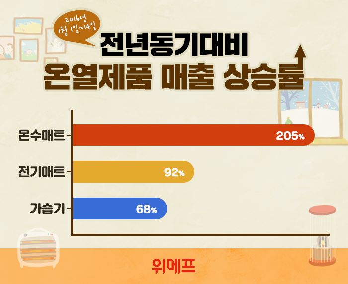 [아시아경제 권용민 기자] 소셜커머스 위메프가 지난 1일부터 14일까지 약 2주간 가습기와 온수매트, 전기매트 매출액을 조사한 결과 전년 동기대비 최대 205% 매출 상승을 보였다고 15일 밝혔다. 이달들어 연일 영하의 날씨가 이어진 영향이다.이는 지난해 같은기간(2015년1월1~14일) 대비 온수매트는 205%, 전기매트92%, 가습기는 68% 상승한 수준이다. 전용덕 위메프 디지털팀 MD는 "작년 12월 이상 고온으로 인해 계절가전 제품 매출이 소폭 상승하는데 그쳤지만 새해 들어 연일 이어지는 영하의 날씨와 함께 매출이 늘어나고 있다"며 "추위와 함께 건조해진 날씨 탓에 가습기 상품도 매출 회복세를 보이고 있다"고 분석했다.위메프 계절가전 상품은 ▲생수병을 사용해 가습하는 어메이징 V4 가습기(2만9800원) ▲일월 전기매트·온수매트(1만7800원부터) ▲한화 온돌 모노륨 전기매트·전기장판(8900원부터)등이 있다. 이 밖에도 충전식 손난로(2만2900원부터), MILL 전기 컨벡터(8만8000원), LG 스팀가습기(15만3000원), 삼성 인버터 제습기(29만9000)원 등이 준비돼 있다.권용민 기자 festym@asiae.co.kr<ⓒ세계를 보는 창 경제를 보는 눈, 아시아경제(www.asiae.co.kr) 무단전재 배포금지>
