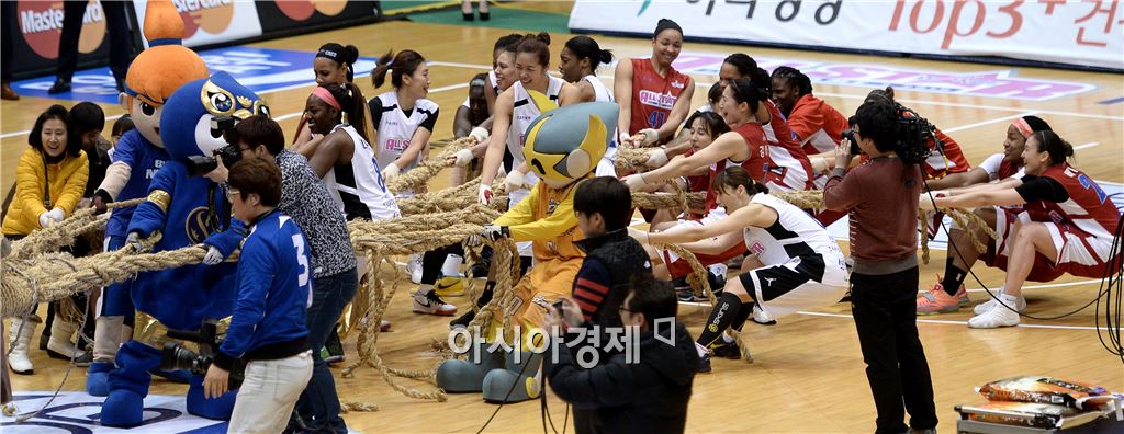 [당진=아시아경제 김현민 기자] 2015~2016 여자프로농구 올스타전이 17일 충남 당진실내체육관에서 열렸다. 올스타선수들이 줄다리기 이벤트를 하고 있다. 김현민 기자 kimhyun81@asiae.co.kr<ⓒ세계를 보는 창 경제를 보는 눈, 아시아경제(www.asiae.co.kr) 무단전재 배포금지>