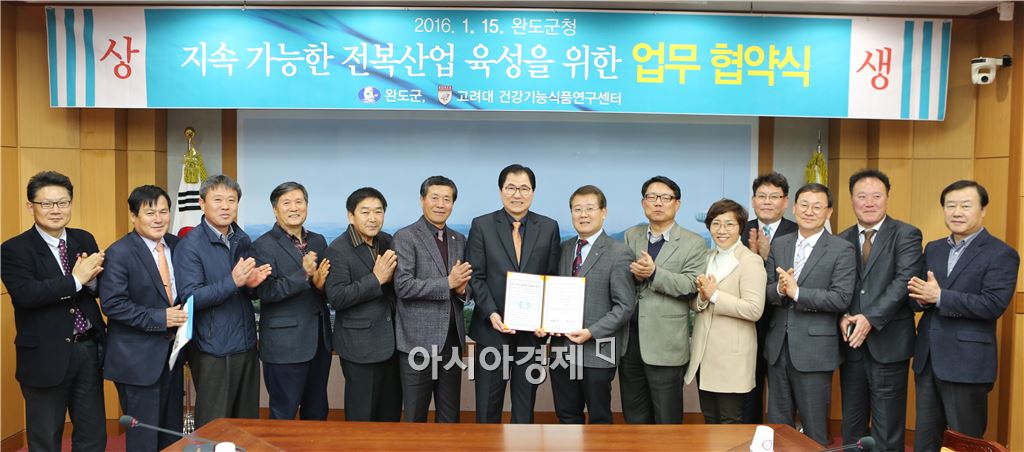 완도군(군수 신우철)은 고려대학교 건강기능식품연구센터(센터장 박현진)와 지난 15일 완도군청 2층 상황실에서 전복 및 전복가공부산물을 활용한 건강기능식품 개발에 대해 상호 협력하기로 하는 업무협약을 체결했다.<br />