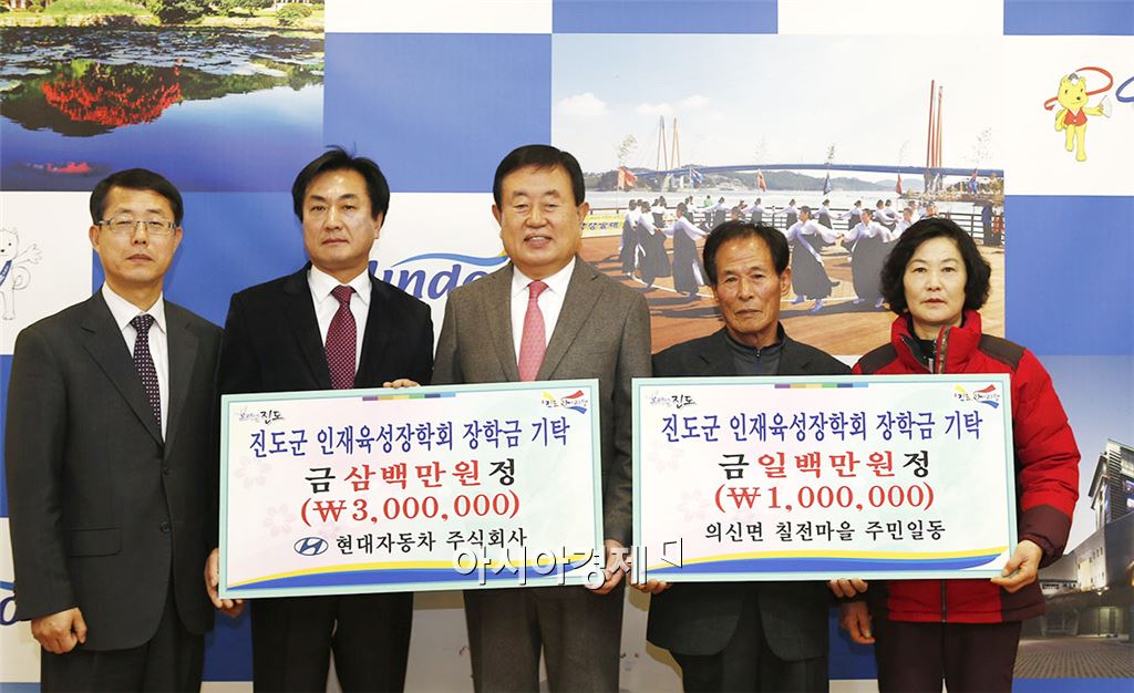 [아시아경제 노해섭 기자]신년초부터 진도군에 인재육성을 위한 장학금 기탁이 줄을 잇고 있다.18일 군에 따르면 지난 14일 현대자동차에서 300만원을, 의신면 칠전마을 주민들이 100만원의 장학금을 각각 (재)진도군인재육성장학회에 전달했다. 의신면 칠전마을 주민들은 진도환경클린운동 마을 평가 결과 시상금 10%를 장학금으로 기탁했다.장학금 기탁 이외에도 현대자동차 진도지점은 지난 2012년부터 의신면에 거주하는 초등학생 소년가장에게 매월 후원금을 전달해 오고 있다.(재)진도군인재육성장학회 관계자는 “신년초부터 지역 인재를 육성하기 위해 기탁된 소중한 장학금이 우리 지역의 미래를 위한 큰 힘이 될 것”이라며 “지역인재 육성에 더욱 더 앞장서 나가겠다”고 말했다.한편 진도군은 인재육성장학금 100억원을 목표로 하고 있으며, 1월 18일 현재 96억원이 조성됐다.노해섭 기자 nogary@<ⓒ세계를 보는 창 경제를 보는 눈, 아시아경제(www.asiae.co.kr) 무단전재 배포금지>