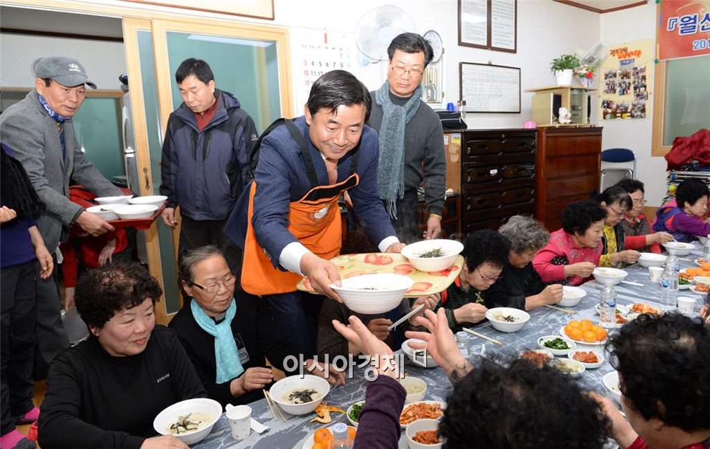 광주시 남구 월산2동 경로당에서 18일 열린 ‘월산동 통친회 신년맞이 떡국나눔’ 행사장에서 최영호 남구청장이 경로당 어르신들에게 떡국 배식봉사를 하고 있다. 사진제공=광주시 남구<br />